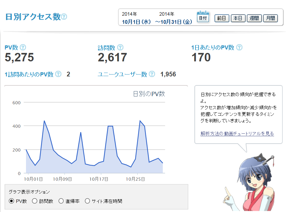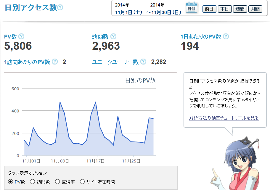 今までの記録まとめ2014年5月=344pv(144訪問)6月=1925pv(957訪問)7月=3611pv(1721訪問)8月=2229pv(1014訪問)9月=3954pv(1895訪問)10月=5275pv(2617訪問)11月=5806pv(2967訪問)