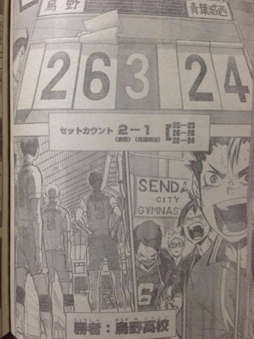 烏野高校。リベンジ成功、まぁ妥当ですな。来週の及川さんの反応が気になる。次はいよいよ白鳥沢か!?