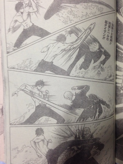 ジェット釘パンチ!!この新技、なんかものすごい既視感がある。ジェットピストル!とどう違うのか誰かに説明してほしい。裏の世界!?世界と書いてチャンネルと読ますあたり凄くイカしてる。小松は今も瀕死状態。酸素の葉(だっけ)再登場、便利だね。