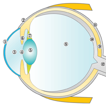 視力に大きく関わるのは⑤の水晶体と⑦の毛様体筋(もうようたいきん)です。